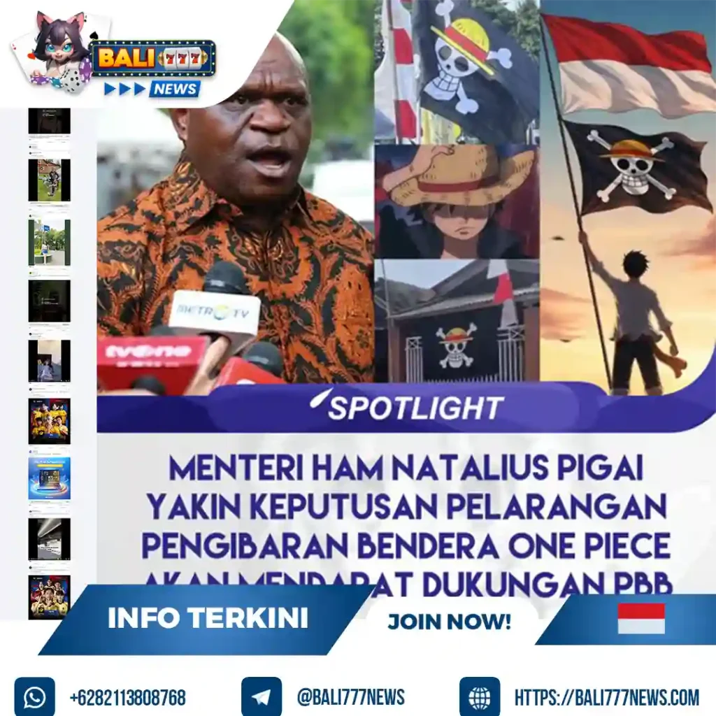 Dalam sebuah pernyataan resmi, Menteri Hukum dan Hak Asasi Manusia (Kemenkumham), Ham Natalius Pigai, mengejutkan publik dengan mengungkapkan keyakinannya bahwa kebijakan pelarangan penggunaan bendera One Piece akan mendapatkan dukungan dari Perserikatan Bangsa-Bangsa (PBB). Kebijakan ini menjadi sorotan media nasional dan internasional karena melibatkan elemen budaya populer yang sangat dikenal di kalangan masyarakat, terutama para penggemar anime.